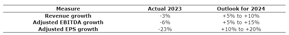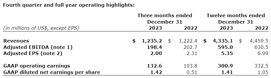 For the full year ended Dec. 31, 2023, revenues were $4.34-billion, down 3 per cent (3 per cent in local currency) and adjusted EBITDA was $595-million, down 6 per cent (6 per cent in local currency) versus the prior year. Adjusted EPS was $5.35, relative to $6.99 in the prior year. Adjusted EPS for the year would have been approximately two cents lower excluding foreign exchange impacts. GAAP operating earnings were $300.9-million as compared with $332.5-million in the prior year. GAAP diluted net earnings per share were $1.41 compared with earnings per share of $1.05 in the prior year, with the prior year impacted by a loss on disposal of certain operations, including Russia. The 2023 GAAP diluted net earnings per share would have been approximately two cents lower excluding changes in foreign exchange rates.