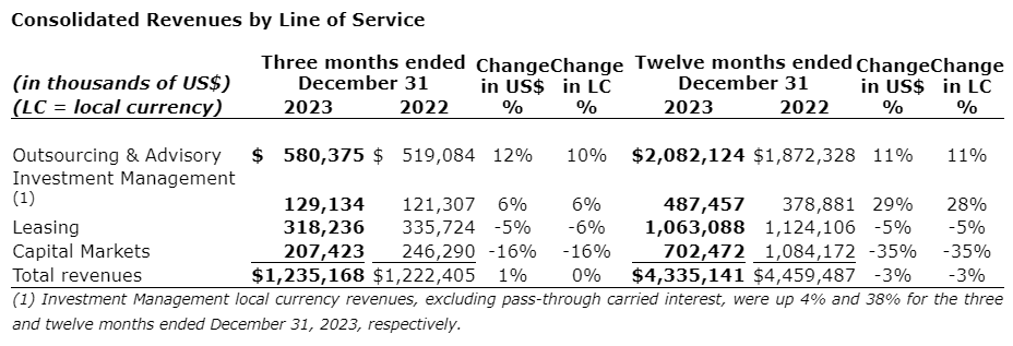 For the year ended Dec. 31, 2023, consolidated revenues decreased 3 per cent on a local-currency basis on lower capital markets and, to a lesser extent, leasing activity, partly offset by strong growth in investment management, and outsourcing and advisory. Consolidated internal revenues measured in local currencies were down 8 per cent.