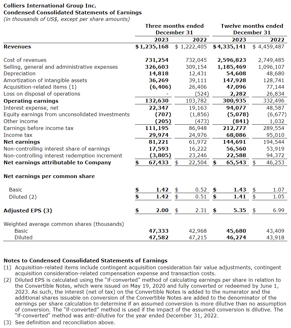 Colliers International Group Inc. has released its operating and financial results for the fourth quarter and year ended Dec. 31, 2023. All amounts are in United States dollars.