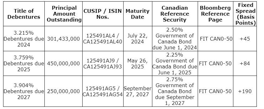 The consideration for each series of debentures payable per each $1,000 principal amount of such series of debentures validly tendered for purchase will be based on the fixed spread specified in the attached table for such series of debentures, plus the yield of the specified Canadian reference security in the attached table for such series of debentures. The consideration does not include the applicable accrued and unpaid interest payment, which will be payable in cash in addition to the applicable consideration. See "description of the offers -- determination of the consideration" in the offer to purchase. The offers are not contingent upon the tender of any minimum principal amount of debentures and the amount of each series of debentures that is purchased in the offers will be determined by CI, in its sole discretion. The offers may be subject to proration as described in the offer to purchase.
