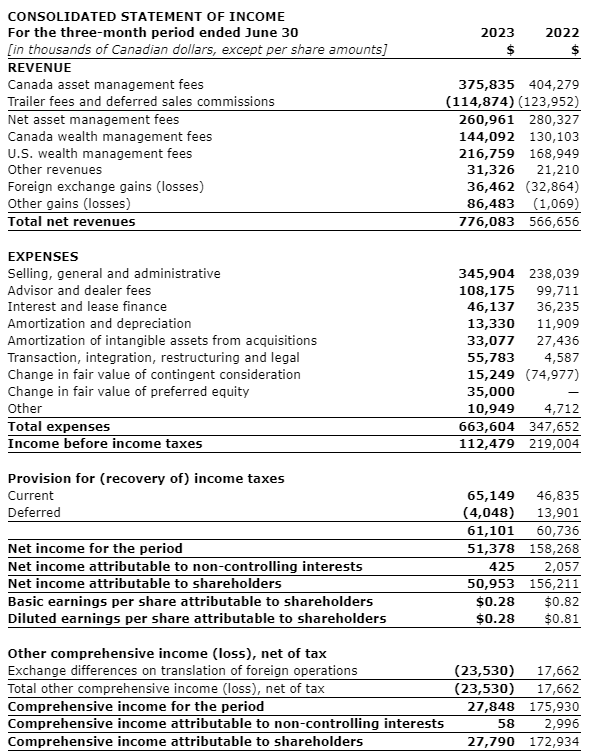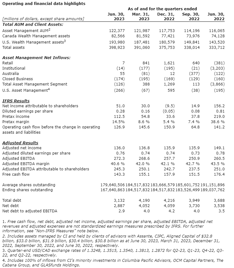CI Financial Corp. has released financial results for the quarter ended June 30, 2023.
