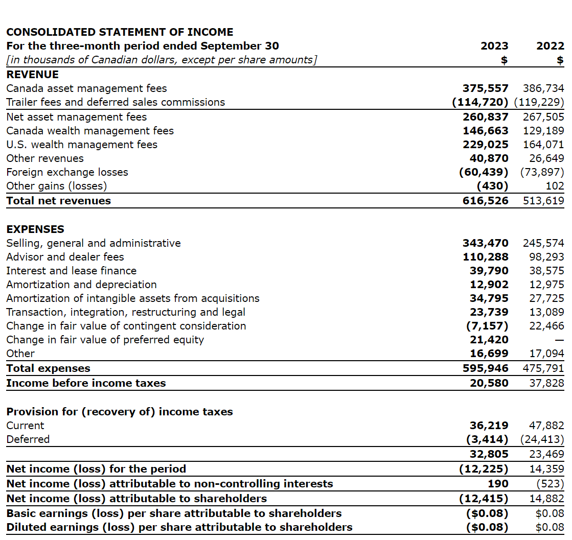 CI Financial Corp. has released financial results for the quarter ended Sept. 30, 2023.