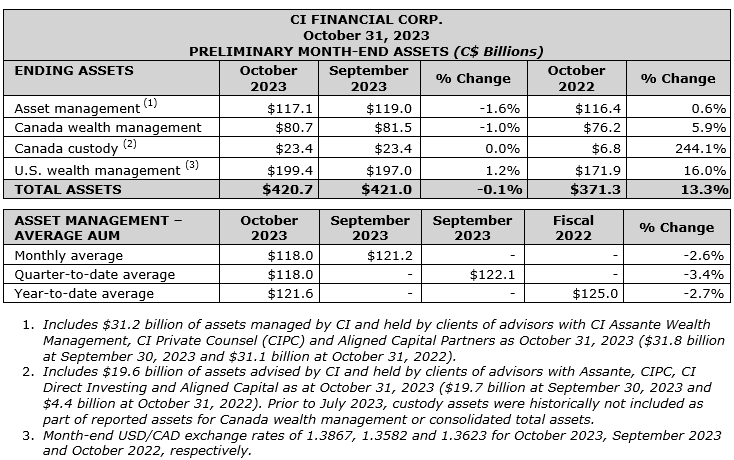 CI FINANCIAL REPORTS TOTAL ASSETS OF $420.7 BILLION FOR OCTOBER 2023
