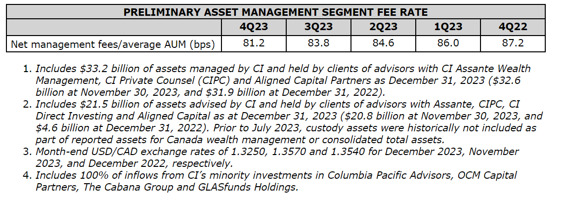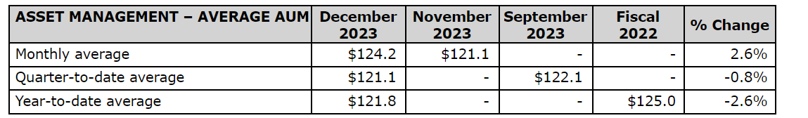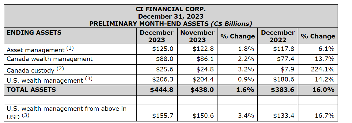 CI FINANCIAL REPORTS TOTAL ASSETS OF $444.8 BILLION FOR DECEMBER 2023