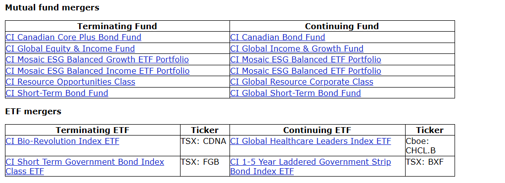 The mergers of CI Canadian Core Plus Bond Fund, CI Resource Opportunities Class, CI Short-Term Bond Fund, CI Bio-Revolution Index ETF and CI Short Term Government Bond Index ETF are to be effected on a taxable basis, resulting in a taxable disposition if the funds are held in a non-registered account. The other mergers will be effected on a non-taxable basis.