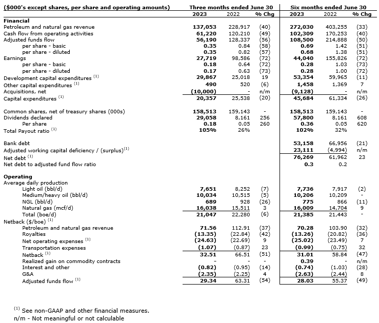CARDINAL ENERGY LTD. ANNOUNCES SECOND QUARTER 2023 OPERATING AND FINANCIAL RESULTS
