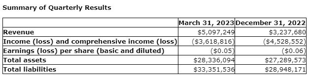 Total assets increased to $28,366,094 from $27,289,573 as at December 31, 2022. The increase in total assets is primarily attributable to an increase in cash from financing activities.