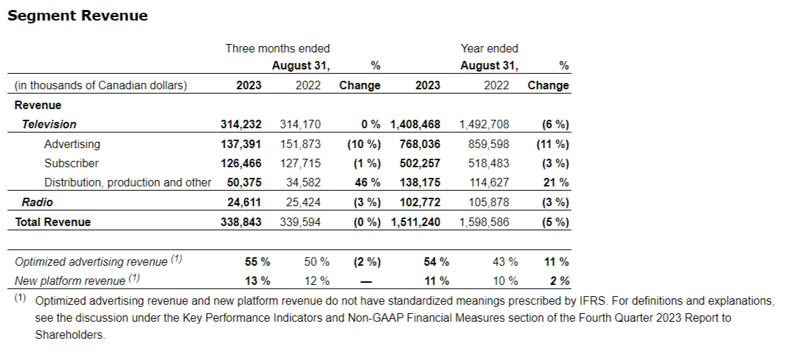 "Our fourth quarter results reflect ongoing weakness in the advertising economy further impacted by more recent distortions resulting from the WGA [Writers Guild of America] and SAG-AFTRA [Screen Actors Guild - American Federation of Television and Radio Artists] strikes that persisted much longer than anticipated," said Doug Murphy, president and chief executive officer. "We are focused on what we can control as we navigate through these challenges. We will prudently redirect capital from dividends to debt repayment. Our intense pursuit of efficiencies and improved productivity is resulting in significant expense reductions as we streamline our operating model and evolve our business into a multiplatform aggregator of premium video with leading cross-platform monetization capabilities. Corus will benefit from a more normalized content supply in the quarters ahead with an improved cost structure as we await a concurrent improvement in the advertising economy."