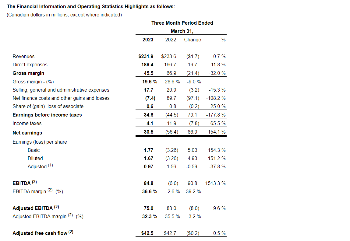 Total revenues for the quarter were $231.9-million, compared with first quarter 2022 revenues of $233.6-million. Gross margin for the quarter was $45.5-million, compared with first quarter 2022 gross margin of $66.9-million. Adjusted EBITDA (earnings before interest, taxes, depreciation and amortization) for the quarter was $75.0-million, compared with first quarter 2022 adjusted EBITDA of