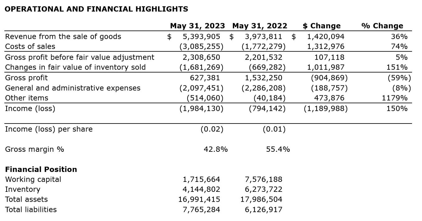 Christina Lake Cannabis Corp. has released its financial results for the second quarter ended May 31, 2023. All amounts are expressed in Canadian dollars unless otherwise noted.