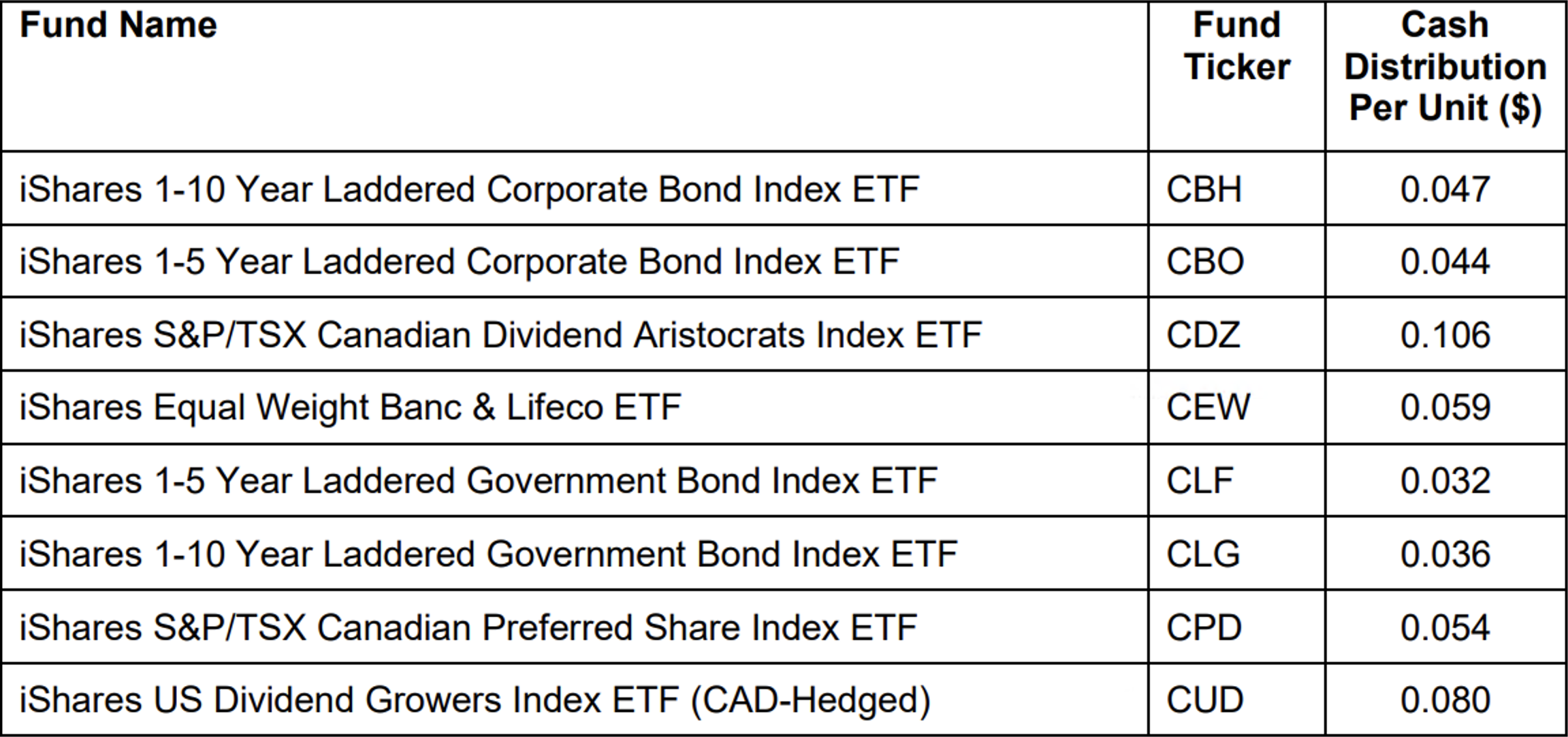 BlackRock Asset Management Canada Ltd. has declared October, 2023, cash distributions for the iShares exchange-traded funds listed on the Toronto Stock Exchange or the NEO Exchange which pay on a monthly basis. Unitholders of record of a fund on Oct. 26, 2023, will receive a cash distribution payable in respect of that fund on Oct. 31, 2023.