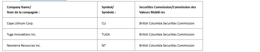 Effective immediately, the companies named in the attached table have been suspended pursuant to Canadian Securities Exchange Policy 3.