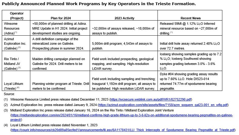 "We are incredibly excited for the year ahead. The Trieste formation is rapidly emerging as a significant lithium spodumene region in Canada and witnessing considerable work from key operators. Liberty is strategically positioned to benefit from those developments and work programs, aligning with Comet Lithium's extensive exploration program," commented Vincent Metcalfe, chair and chief executive officer of the corporation. "Simultaneously, we are working hard on bringing the entire portfolio to the forefront, with multiple properties slated for work programs in 2024. The Troilus camp is experiencing increased activity, and Comet Lithium's 2024 anticipated field program will be exciting to follow as we get boots on the ground to support our commitment to this highly prospective area, where, in addition to the very prospective gold-copper targets, the lithium potential has simply never been a focus of exploration until recently. Building a robust pipeline of future prospective assets is also a key focus for 2024, prompting planned exploration programs for properties such as Galli, Pontax and Triple Lithium. We aim to compile and analyze the existing data and pending results to further enhance the corporation's exploration initiatives on those assets," added Mr. Metcalfe.