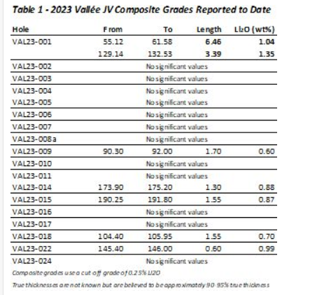 The first hole of the summer program (hole VAL23-01) intersected two separate high-grade pegmatite dikes. The first returned a composite assay grade of 1.04 per cent Li2O (lithium oxide) over 6.46 m from 55.12 m to 61.58 m, and the second, 1.35 per cent Li2O over 3.39 m from 129.14 m to 132.53 m. Four of the remaining holes in which assays have been reported returned assay grades exceeding the cut-off grade of 0.25 per cent Li2O over lengths exceeding one m.