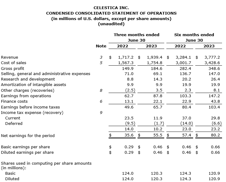 Celestica Inc. has released financial results for the quarter ended June 30, 2023. (All amounts are in U.S. dollars. Per-share information is based on diluted shares outstanding unless otherwise noted.)