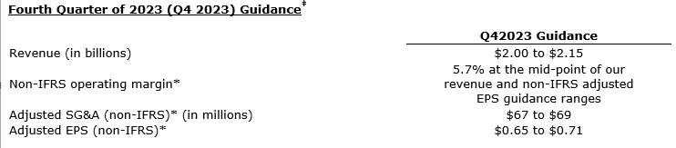 Assuming the achievement of the midpoint of the above revenue and non-IFRS adjusted EPS guidance for Q4 2023, its updated 2023 outlook consists of: