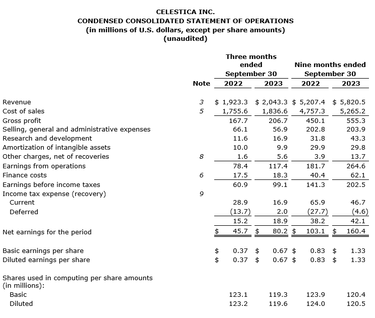 CELESTICA ANNOUNCES THIRD QUARTER 2023 FINANCIAL RESULTS