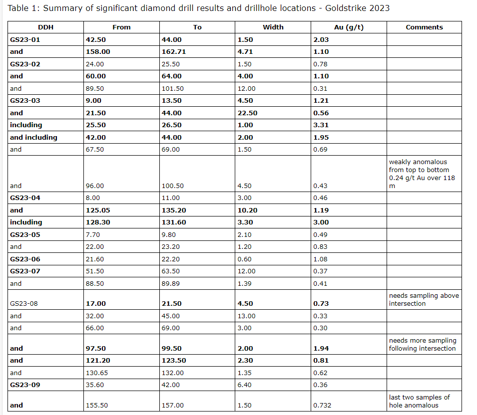 - DDH GS-23-04 -- testing the Clarinda extension showing at Goldstrike returned 1.19 g/t gold (Au) over 10.2 metres, including three g/t Au over 3.3 m starting at 125 m.