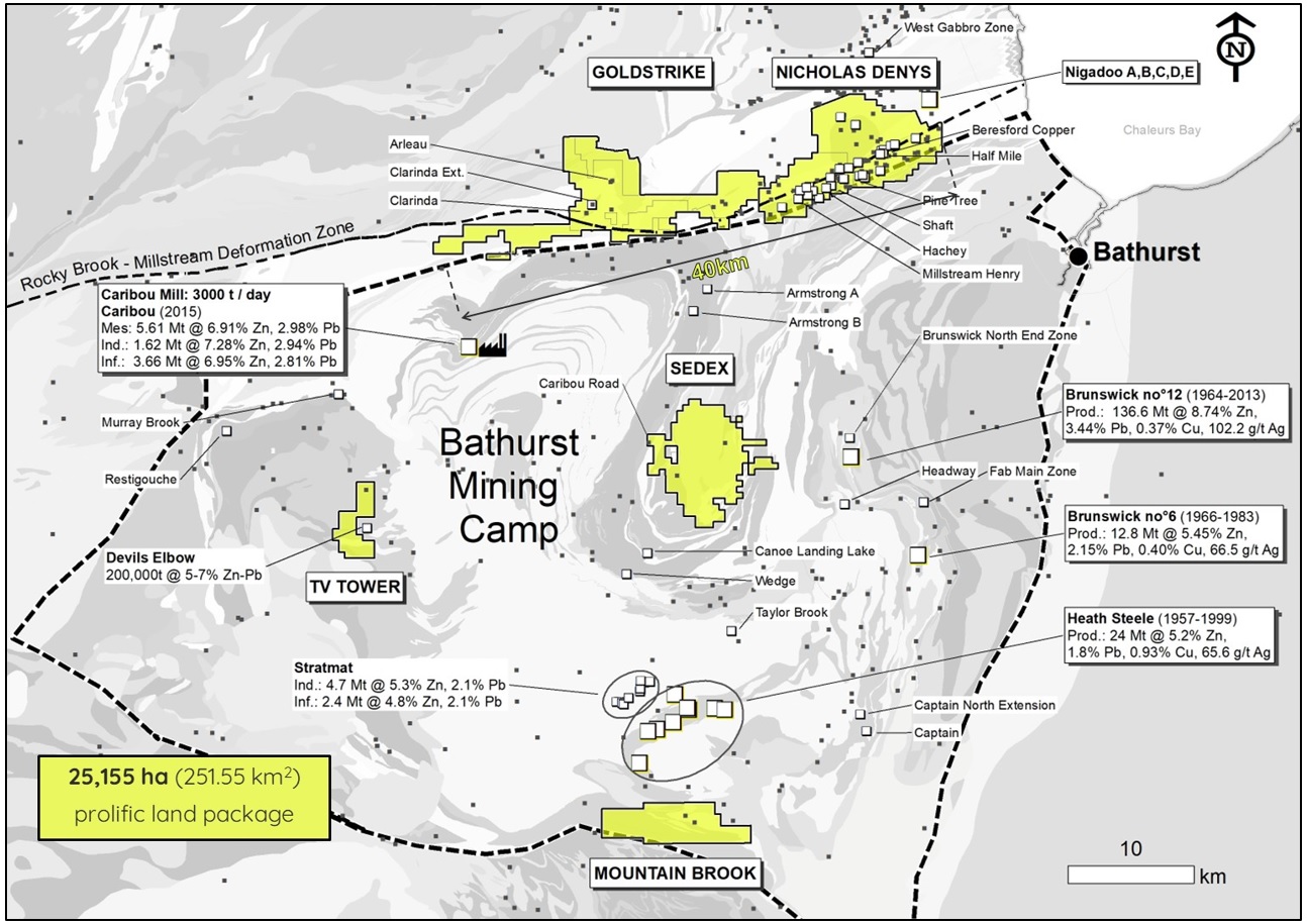 Figure 1: Location of the Company's 5 projects within the Bathurst Mining Camp and the 40km long corridor along the Rocky Brook-Millstream Deformation Zone hosting numerous high-grade gold, silver, lead, zinc, and copper occurrences