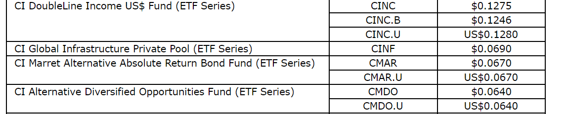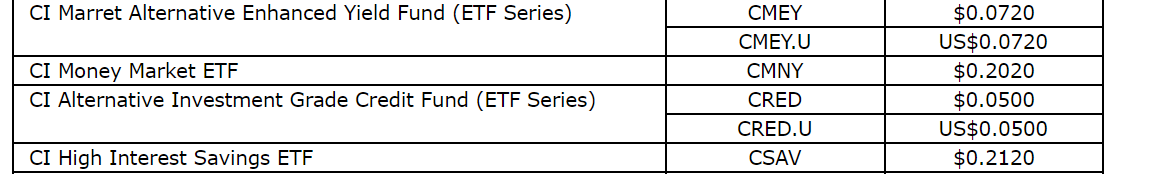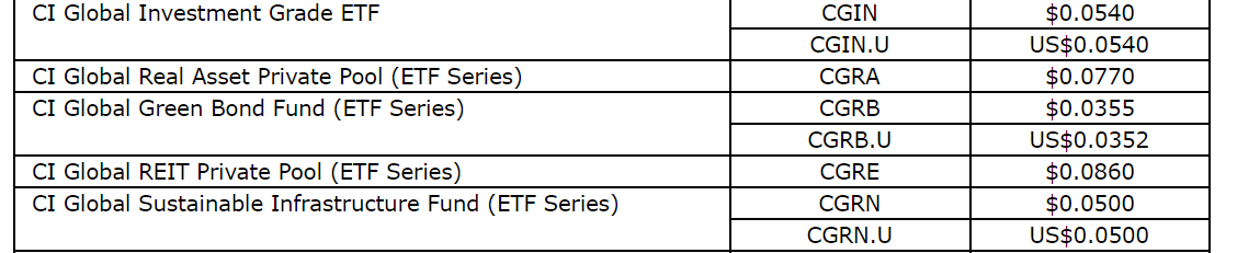 CI Financial Corp.'s CI Global Asset Management has declared regular cash distributions for the month ending Oct. 31, 2023, in respect of the CI exchange-traded funds. All distributions will be paid on or before Oct. 31, 2023, to unitholders of record on Oct. 25, 2023. The ex dividend date for all ETFs is Oct. 24, 2023, with the exception of CI High Interest Savings ETF, CI Money Market ETF and CI U.S. Money Market ETF, which have an ex dividend date of Oct. 25, 2023.