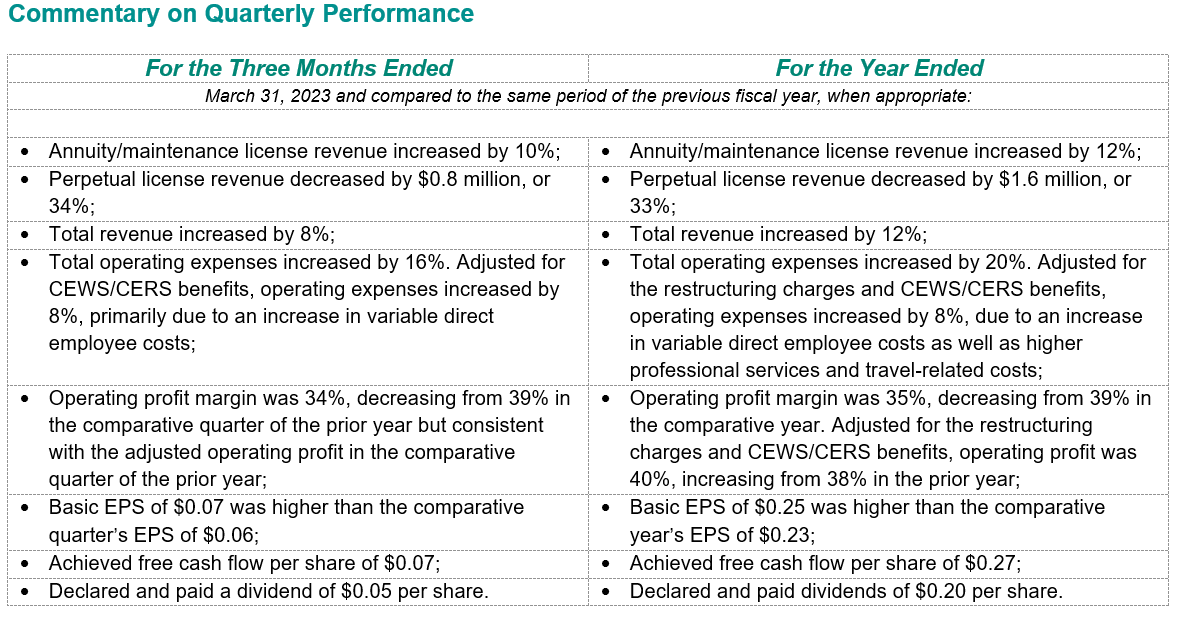 Total revenue for the three months and year ended March 31, 2023, increased by 8 per cent and 12 per cent, respectively, compared with the same periods of the previous fiscal year, due to increases in both software licence revenue and professional services revenue.