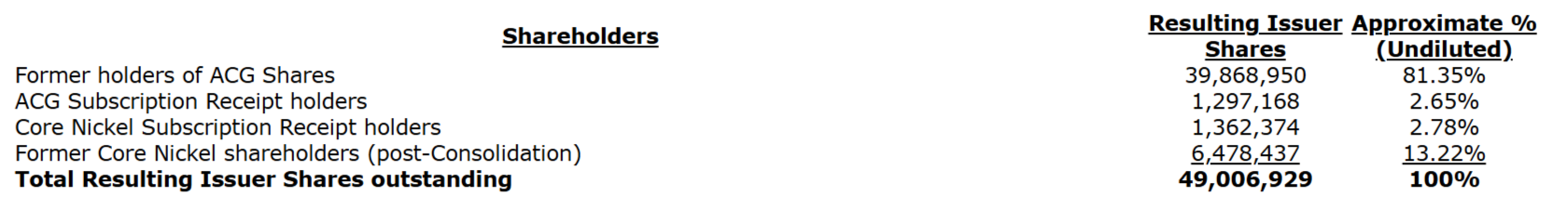 - ACG has become a wholly owned subsidiary of the resulting issuer.