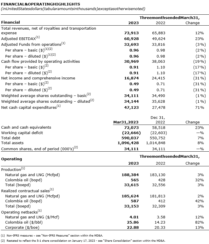 Canacol Energy Ltd. has released its financial and operating results for the three months ended March 31, 2023. Dollar amounts are expressed in U.S. dollars, with the exception of Canadian-dollar unit prices where indicated and otherwise noted.