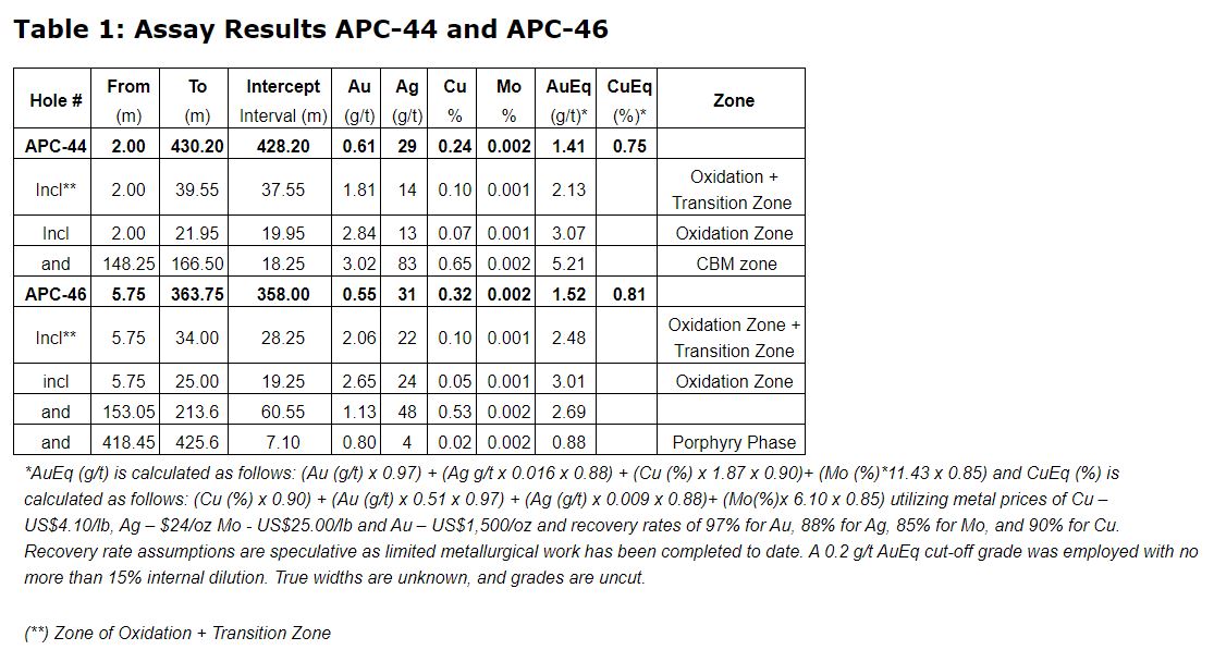 APC-46 bottomed in mineralization in quartz diorite porphyry with the final 7.1 metres averaging 0.88 g/t AuEq.