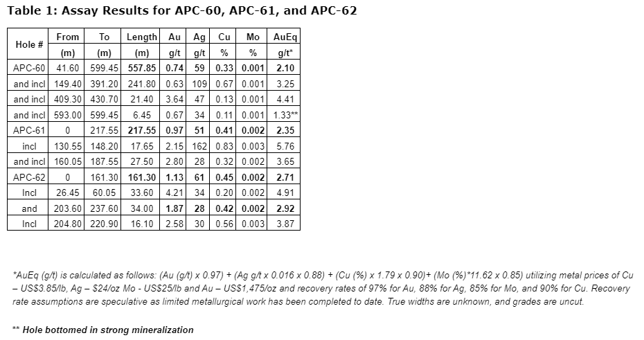 This press release outlines results from three stepout holes: APC-60, APC-61 and APC-62. APC-60 was drilled to test an upper zone of sheeted CBM veining and the main brecciated porphyry body located directly below. APC-61 was a hole drilled to test continuity of shallow and outcropping mineralization in the southern portion of the Apollo porphyry system while hole APC-62 was drilled to outline high-grade mineralization along the eastern contact zone between the main brecciated porphyry body and the enveloping, mineralized quartz diorite. Results for these holes are summarized below.