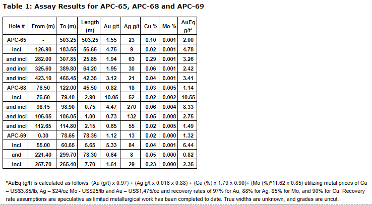 APC-65 was drilled steeply northeastwards from Pad 10 to a maximum downhole depth of 530.75 metres (529 meters vertical due to topography). The hole intersected continuous mineralization over 503.25 metres commencing from surface. The first 126.25 metres downhole cut the recently discovered outcropping sheeted CBM vein zone, located above and adjacent to the main brecciated porphyry body. The first 59 metres of this zone was drilled in mineralized saprolite and oxidized vein material. Upon exiting the weathered zone, sheeted CBM vein mineralization was intercepted hosting up to 3% pyrite and sphalerite respectively. Below this, the hole continues for 377 metres downhole in the brecciated porphyry zone with a sulphide cement matrix hosting up to 1.0% chalcopyrite, 2.0% pyrite, 0.2% sphalerite, 0.1% galena and pyrrhotite (up to 1.0%) with assay results as follow: