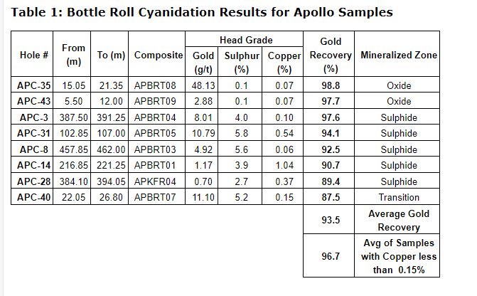 Ari Sussman, executive chairman, commented: "The Apollo system is fortunate to benefit from simple metallurgy with excellent recovery rates expected for gold, silver and copper. We look forward to continued improvement in test work with next results expected in Q1 2024."