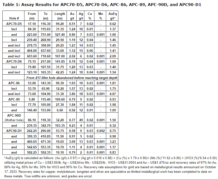 31.30 metres at 4.07 g/t gold equivalent from 35 metres below surface in APC-86.
