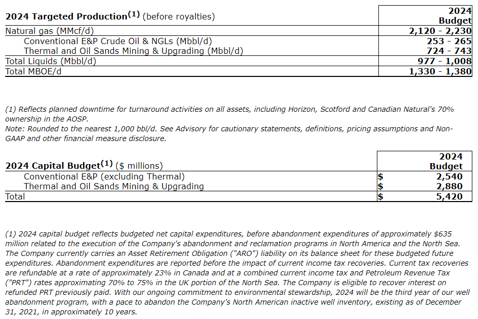 - The company's 2024 capital budget is disciplined, targeted at approximately $5.4-billion, excluding abandonment and reclamation expenditures, and targets to provide near-term production growth in 2024, and mid- and long-term production and capacity growth beyond 2024. Highlights of the 2024 budget include: