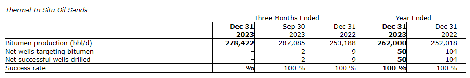 - Record annual thermal in situ production levels averaged 262,000 bbl/d in 2023, an increase of 4 per cent from 2022 levels. The increase in thermal in situ production is driven by strong execution on the company's strategic development plan, including capital-efficient pad additions at Primrose and Kirby in 2023, partially offset by natural field declines: