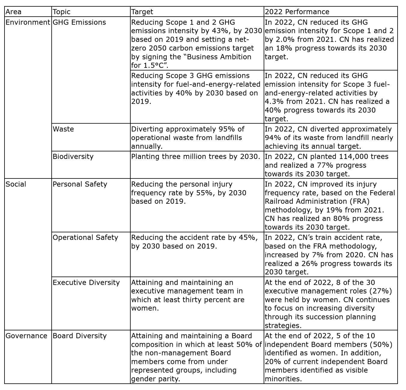 CN's key ESG targets and 2022 progress are shown in the attached table.