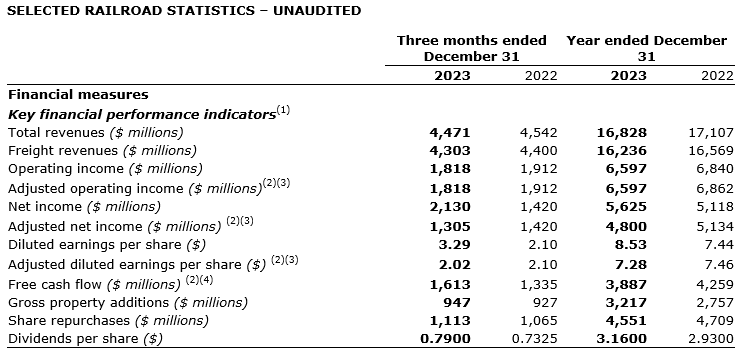 Revenues for 2023 decreased by 2 per cent to $16,828-million, when compared with 2022. The decrease in revenues was mainly attributable to lower shipments of intermodal, crude oil, U.S. grain and forest products, as well as lower container storage fees and lower fuel surcharge revenues as a result of lower fuel prices, partly offset by freight rate increases, higher Canadian grain export shipments and higher shipments of potash, and the positive translation impact of a weaker Canadian dollar.