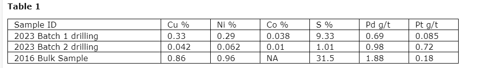 The program and independent review of batch 1 and 2016 bulk sample, medium- to high-sulphide-type mineralized materials encompassed gravity, flotation and magnetic separation test work. Bench tests successfully produced saleable up to 30 per cent Cu and between 37 and 62 grams per tonne platinum group metals concentrates with 80-per-cent Cu recovery. An independent review of the mineralogy of the deposit estimates the pyrrhotite (iron sulphide) to pentlandite (Ni sulphide) ratio is in the range of 35:1 in the massive and semi-massive sulphide zones of the deposit, with the Ni deportment to pentlandite to be about 71 per cent envisioning the creation of a potentially payable 10 per cent Ni-bearing concentrate with 51-per-cent Ni recovery.