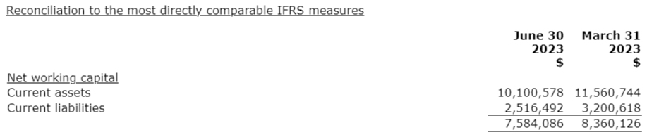 As of June 30, 2023, the company had net working capital of $7.6-million, consisting of cash, bank deposits and marketable securities totalling $5.3-million, together with accounts receivables and other current assets of $4.8-million, less accounts payable and other current liabilities of $2.5-million.