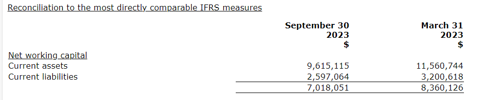 As of Sept. 30, 2023, the company had net working capital of $7-million, consisting of unrestricted free cash, bank deposits and marketable securities totalling $5.6-million, together with accounts receivables and other current assets of $4-million, less accounts payable and other current liabilities of $2.6-million.