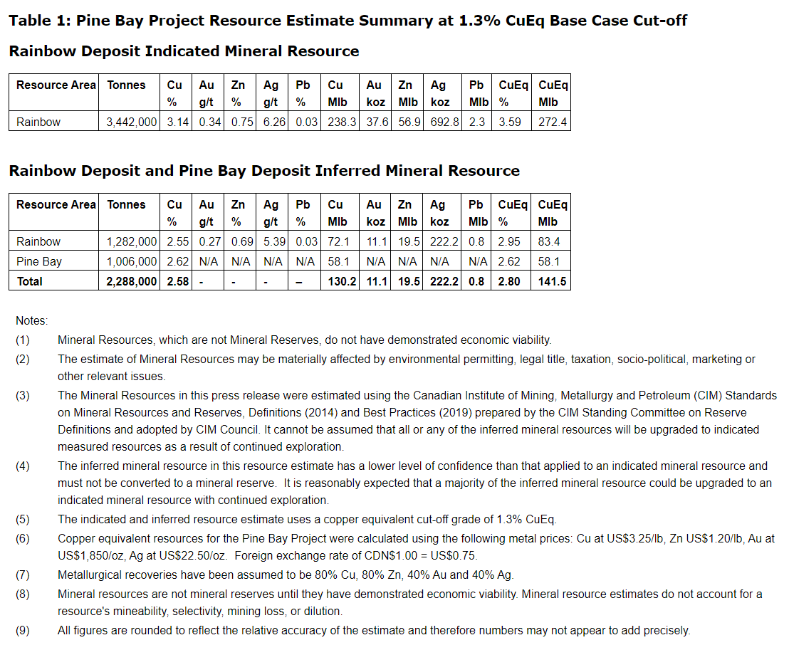 The mineral resource estimate, contained within the mineral lease, consists of the Rainbow deposit with an indicated mineral resource of 3.44 million tonnes at 3.59 per cent copper equivalent, containing 272.4 million pounds copper equivalent (comprising 238.3 million pounds copper, 56.9 million pounds zinc, 37,600 ounces gold, 692,800 ounces silver and 2.3 million pounds lead) and an inferred mineral resource of 1.28 million tonnes at 2.95 per cent copper equivalent containing 83.4 million pounds copper equivalent (comprising 72.1 million pounds copper, 19.5 million pounds zinc, 11,100 ounces gold, 222,200 ounces silver and 800,000 pounds lead); and the Pine Bay deposit with an inferred mineral resource of 1.0 million tonnes at 2.62 per cent copper containing 58.1 million pounds copper.