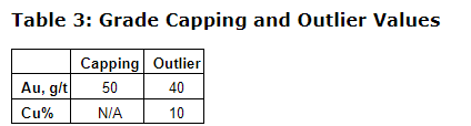 Cumulative probability plots were used to establish gold and copper capping and outlier values. The attached table summarizes the capping done on the assays prior to compositing and the outlier restrictions done to the composites during interpolation. For composite grades above the outlier value provided, and at distances greater than five m from the data, the value is essentially capped.