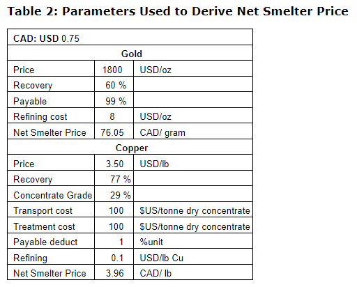 These parameters assume a copper concentrate with gold credits as per the preliminary metallurgical testing done in 2008 and 2010 and overseen by Gary Hawthorn, PEng.