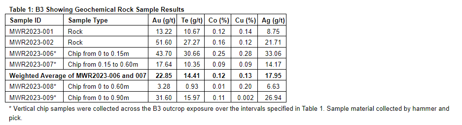 A total of 67 soil samples were taken around the B3 showing with two rock and four chip samples taken from the B3 outcrop itself. Soil sampling around the B3 showing has outlined an area roughly 100 metres by 150 metres with gold-in-soil values of greater than 80 parts per billion (ppb). Additional highlights of soil sampling taken around the B3 area include 3,931 ppb Au and 1,410 ppb tellurium (Te) in sample MWS2023-018 and 2,518 ppb Au and 740 ppb Te in sample MWS2023-094. Highlights of soil samples taken between the Bluebird 2 showing and the new B3 discovery include 2,194 ppb Au and 1,340 ppb Te in sample MWS2023-042. These samples warrant further follow-up.