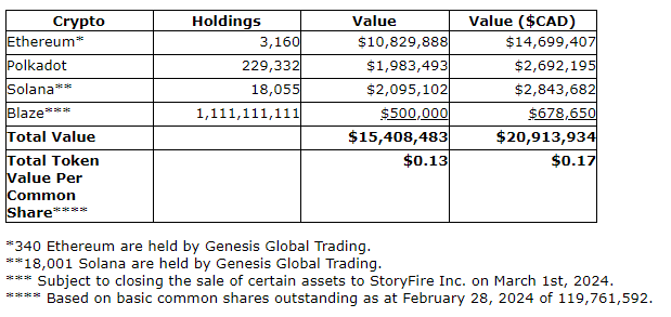 In addition to its cryptocurrency inventory, the company holds approximately $2.5-million ($3.5-million (Canadian)) in cash, a portfolio of valuable crypto domain names and, subsequent to a closing date of March 1, 2024, a 15.3-per-cent interest in StoryFire Inc.