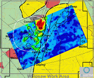An angled perspective of the inverted 3D IP results, viewed from depth below the survey area upward toward the northeast. The high priority Bolas and Condor anomalies are clearly evident, as are several of the moderate, comparatively smaller anomalies (Note: more weak to moderate anomalies were identified, obscured in this perspective view by the vertical edges defining the west-southwest and east-southeast limits of the survey area).