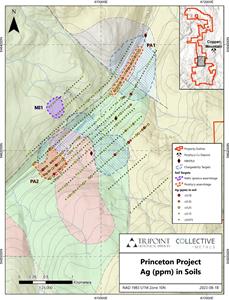 VANCOUVER, British Columbia, Sept. 21, 2023 (GLOBE NEWSWIRE) -- COLLECTIVE METALS INC. (CSE: COMT | OTC: CLLMF | FSE: TO1) (the “Company” or “Collective”) is pleased to announce that it has received assay results for soil samples that were collected in “Phase One” of the Company’s two-phase reconnaissance soil sampling program (the “Program”) conducted in summer of 2023 on the Princeton Copper Project (the “Project”). The Program was designed to identify surface geochemical anomalies related to copper mineralization in close proximity to known historic copper mineral showings. Assay results from Phase One samples collected from the southern part of the Project with historic copper showings hosted in a structural corridor (the “Trojan – Condor Corridor”) are highlighted below (Figures 1 to 4).