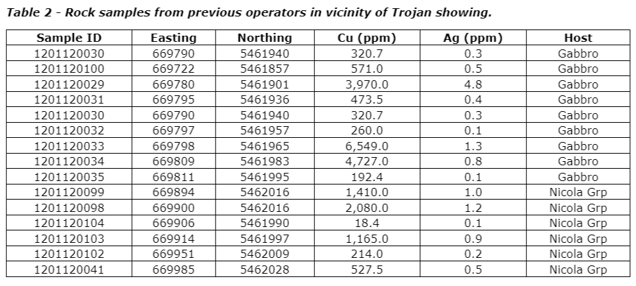 The results of the limited 2023 program are significant, as the highest-grade copper sample was taken from subcrop, whereas the previous samples were all described as locally derived float samples. A total of 14 samples were taken by the previous operator, nine of mafic intrusive within approximately 130 metres of the Trojan showing and an additional six within 185 m in the immediately adjacent Nicola group host rocks (see the table entitled "Rock samples from previous operators in vicinity of Trojan showing"). Mineralization was described as comprising both malachite and chalcopyrite, predominantly hosted within quartz and/or carbonate veinlets and/or stockworks, with a subordinate proportion from epidote-altered gabbro. These descriptions are consistent with porphyry-style alteration and mineralization (see the company news release dated Aug. 1, 2023), particularly with respect to mineralization being hosted within veinlets and/or stockworks, and provided strong motivation for subsequent drilling by the previous operator.