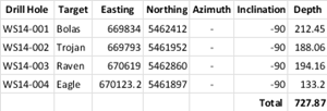 In 2014, the previous operator completed 727.87 m of diamond drilling in four holes designed to test coincident strong chargeability anomalies and copper mineralization on surface1 (see Table 3).