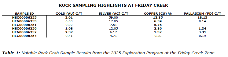 Nine rock samples from the program returned copper grades exceeding 0.5 per cent, including six overlimit grab samples with grades ranging from 1.132 per cent to 13.35 per cent copper. These results highlight the prospective nature of the Friday Creek area.