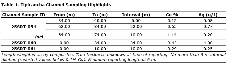 Coppernico Metals Inc. has released initial surface channel sampling results from the Tipicancha target, a large-scale epithermal system with potential for a porphyry source at depth. Notable results include 22 metres of 0.65 per cent copper and 0.77 gram per tonne silver, including 10 m of 1.14 per cent Cu and 0.20 g/t Ag, true widths unknown (table 1). These results further demonstrate the mineral potential of Coppernico's consolidated land position as the company advances a growing pipeline of high-quality exploration targets.